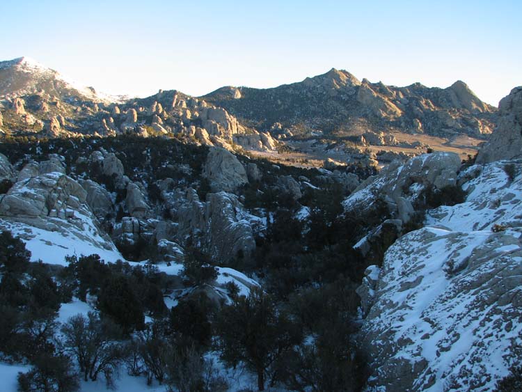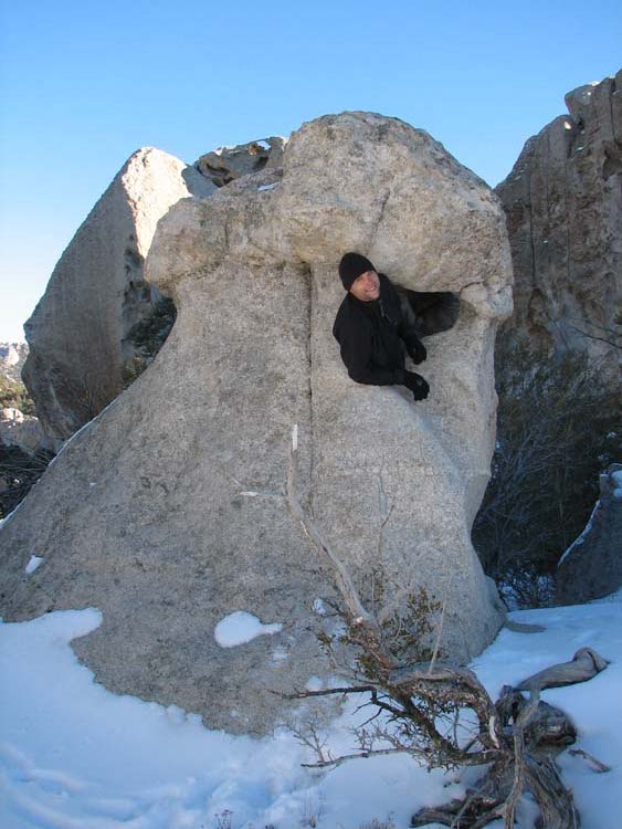 City of Rocks is located right on the Oregon Trail, so people have known about it for quite a long time. Only relatively recently have the rock climbing bums started to move in. We were spared the smell of patchouli and broken down VW vans by the 6” of snow on the ground, which makes climbing a bit more difficult. Never ones to let a little snow deter our fun, we grabbed boots and cameras and headed out for a little exploration. We spent three hours weaving between rock formations and trying to get on top of at least one. We never did get to the top of any, but we did find all kinds of interesting formations and fun (in the summer) rock climbing routes. Even better, we didn’t see a single other footprint the whole time.