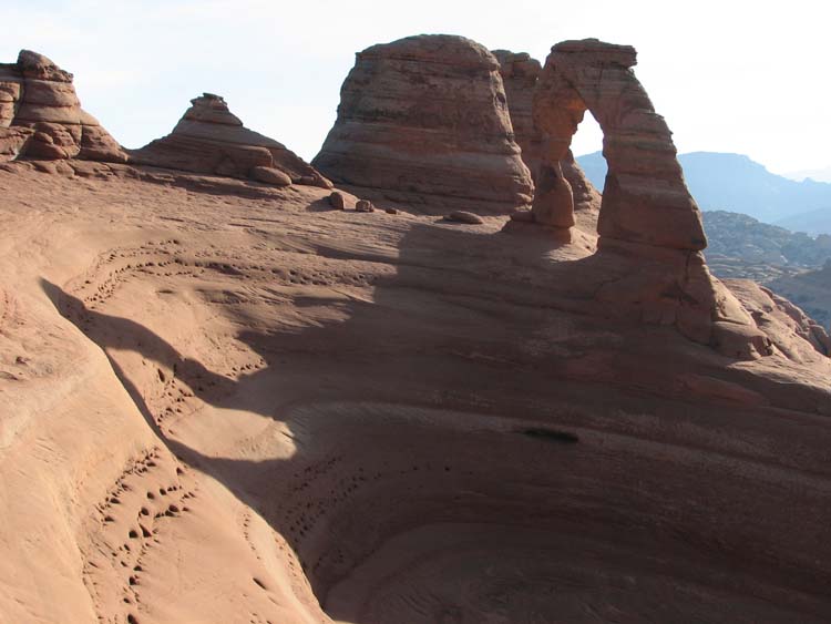 “What? Why are you going back to Moab? Didn’t you get your fill a week ago?” Well, no actually. We were only there for one day, and there are a whole bunch of other things to do in Moab. Take, for example, Arches National Park. That’s where we went in the morning. I’ll give you a dollar if you can guess what makes Arches National Park special. No Timmy, it doesn’t have a large canyon. No Rebecca, Bob Marley doesn’t sing about it, that would be Zion. That’s right Jim Bob, there are lots and lots of arches there! A surprisingly large number actually. The one we chose to hike to was Delicate Arch, which is featured on the Utah license plate. Accordingly, it is a very popular hike. Unless you hike it early on a cold December morning. The temperature may not have been above freezing, but the sun was up and the arch was impressive. It really does look delicate, like you could almost push it over. No, I didn’t try, I didn’t think anyone would appreciate that.