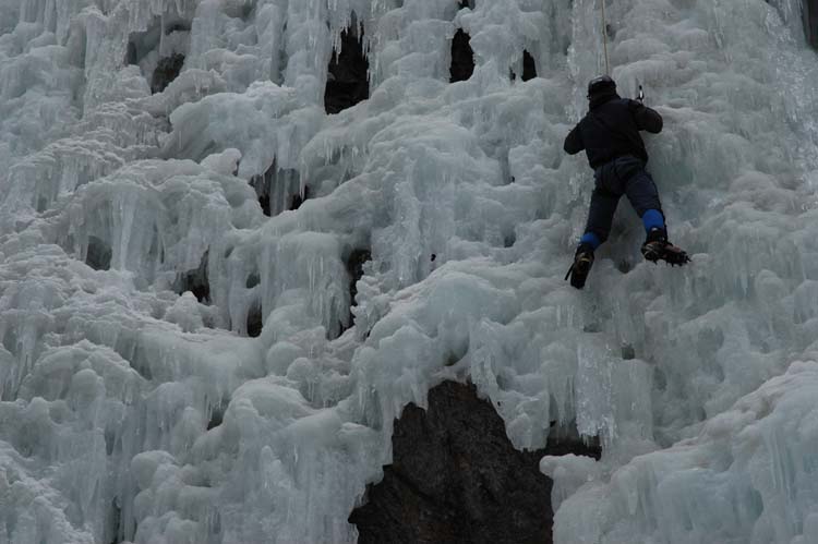 The next day, I finally got the gear I need and we got out on the ice. The basic instructions for ice climbing are “kick, kick, whack, whack.” Kick in your crampons, take a step up, then whack in your ice axes. Rinse, lather, repeat. Well, except for the rinse and lather part, which I could have used because I really needed a shower, it had been awhile. Anyway, we climbed around in a part of the park called South Park (because it’s the Southern part of the park, not because there are a bunch of dysfunctional cartoon characters living there). It was great and we were on some easier routes, which were great for learning. Later on, we headed on down to a different part of the park called The Schoolhouse, which had some longer and more difficult climbs. Nate’s rope wasn’t quite long enough to belay from the bottom, so we both got the thrill of being lowered down into the climb from the top. Which scared the crap out of me, because you couldn’t see what it looked like at all before you were committed. Yikes. Needless to say, we both made it out okay and I only peed in my pants just a little bit.