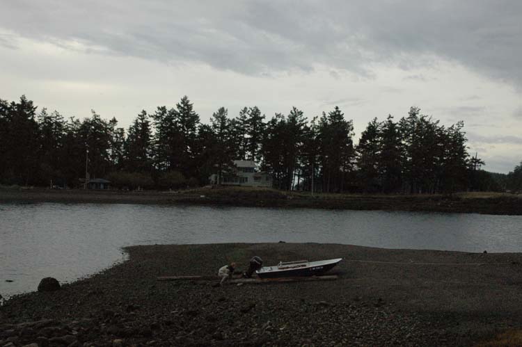The next day, after wrestling with a stubborn outboard motor, we launched Claudia’s 13’ Boston Whaler, which you can see many times in our ream of photos. There was no one else out on the water that day, maybe because it was raining and really cold. But no one ever accused us of being smart, so we went racing around in the boat and had a grand old time. We even got in a short hike on the almost uninhabited (at this time of year at least) Henry Island. We also went over to Posey Island, which disappointed us by not having any posies to frolic in. But it’s actually a neat little island no more than 100 yards in diameter that exactly 0 people live on.