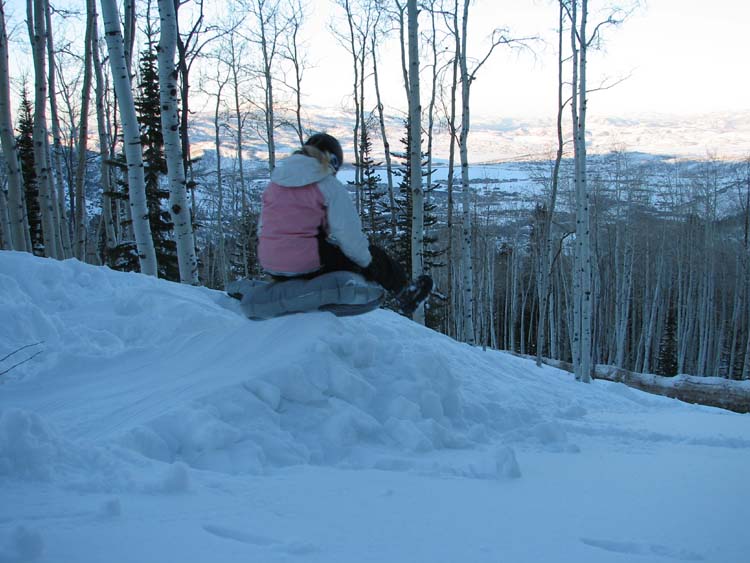 After attending a fun wedding in Long Beach and spending some time with my sweetie, I was back on the road (or actually the air) to Salt Lake City. Nate picked me up at the airport and we headed back up into the mountains, this time bound for The Canyons, which is a resort right next to Park City. My family (Mom, Dad and Rach but no Collin) was staying at the Brice’s ski “chalet,” and they were nice enough to let us dirtbags stay for awhile. In reality the “chalet” was one of the nicest houses I’ve ever been in, and happened to be a quarter of the way up the mountain. The ski run was about 30’ from the back door, and the morning we got there it had just snowed a good 5” of fresh. Sounds like fun to me! We skied the whole day and managed to find fresh tracks for most of it. Nate and I even stopped for lunch with everyone, which is a rare occurrence. Later that night, after sledding down the ski runs and soaking in the hot tub (much better than sitting in the van) we all went out to a great dinner in Park City. Nate and I were considering making bean and cheese burritos in the back of the van, but we were easily convinced by the promise of sea food and meat.