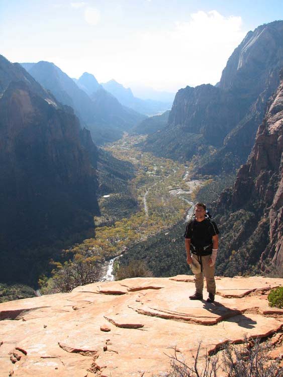 The next day we were a bit more ambitious with our hiking destinations. The first trail we set off on was up to Angel’s Landing, a prominent peak in the middle of the park. I had heard it was a bit scary for the last ½ mile, which involves hiking out a narrow knife ridge with 500’ drops on each side. What I hadn’t heard was that there would be major traffic jams of people too scared to move from the precarious perch they had attained. And the thing was, everyone would panic and freeze up just at the worst part, when two steps away was a big flat landing. Really, the last part only has two or three sections where you really wouldn’t want to fall. Nate, being the hot dog that he is, attempted and completed the hike out and back without using his hands. I’ll admit that I used the chain in a few places, I’m not big on scary heights.